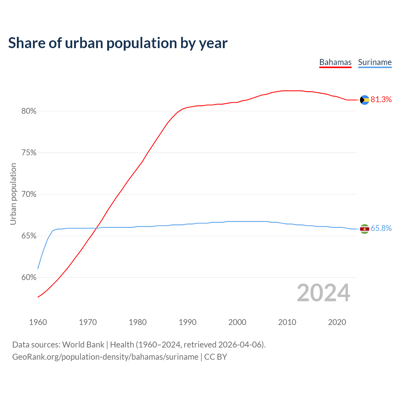From 2004 to 2024, the share of urban population changed from 81.7% to 81.3% in the Bahamas and from 66.7% to 65.8% in Suriname.