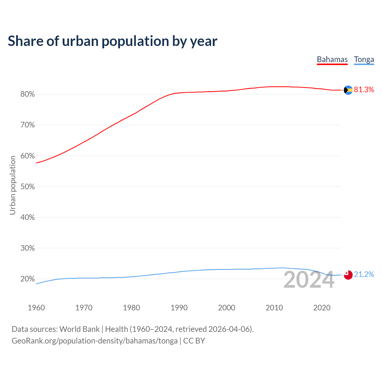 From 2004 to 2024, the share of urban population changed from 81.7% to 81.3% in the Bahamas and from 23.1% to 21.2% in Tonga.