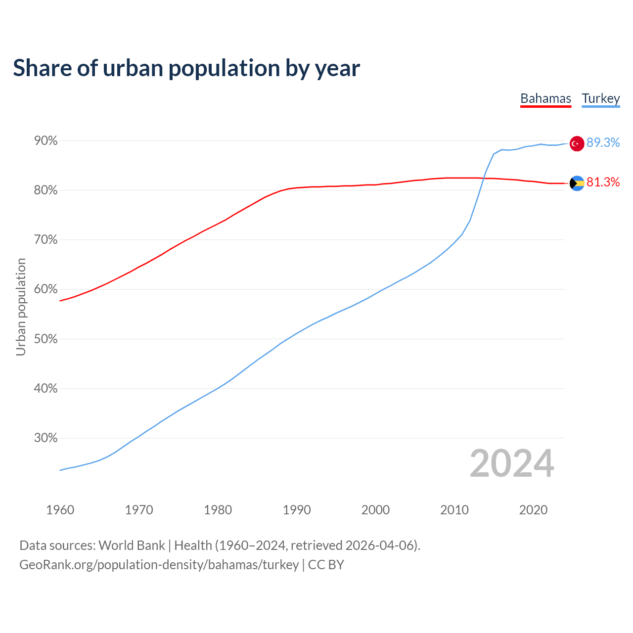 From 2004 to 2024, the share of urban population changed from 81.7% to 81.3% in the Bahamas and from 62.4% to 89.3% in Turkey.