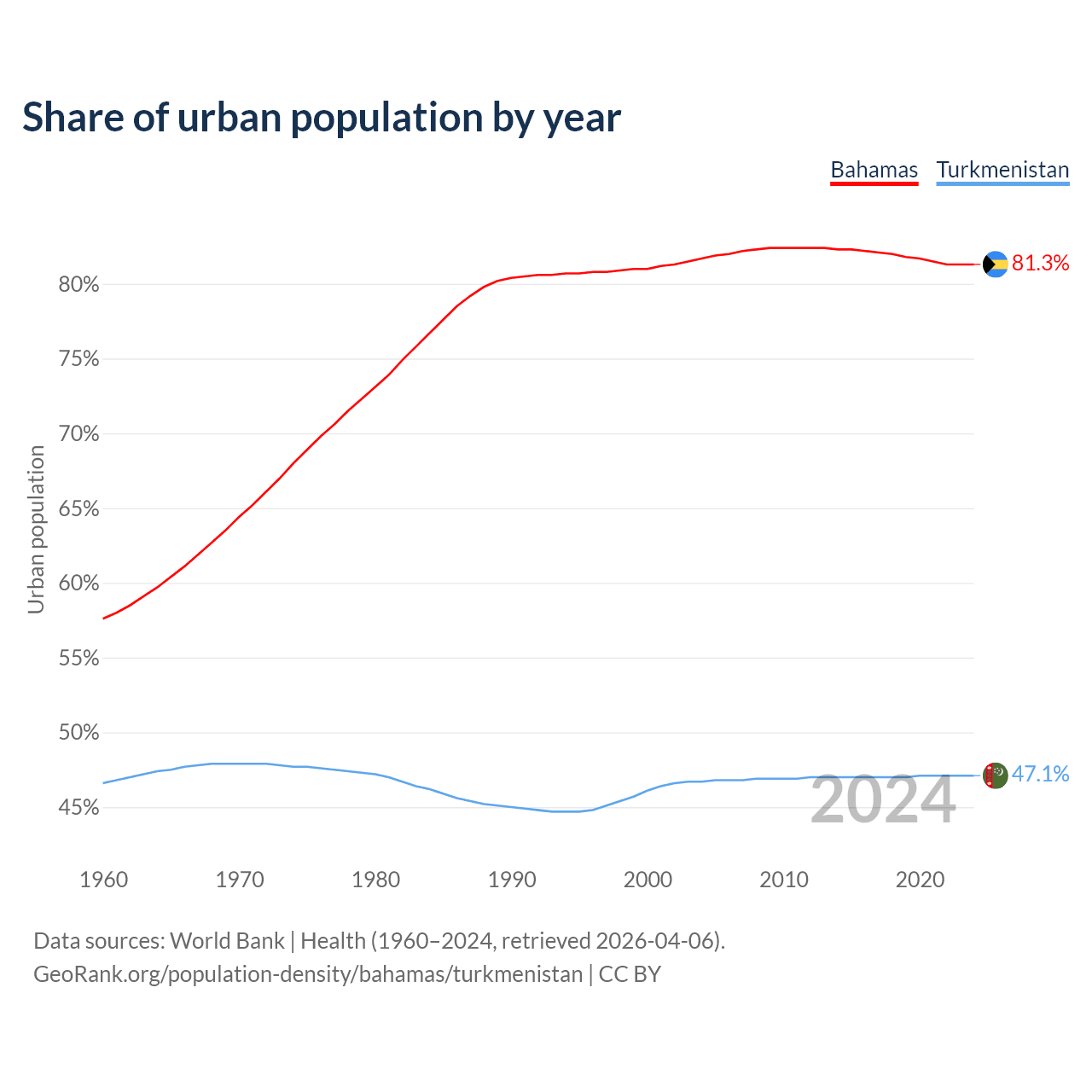 From 2004 to 2024, the share of urban population changed from 81.7% to 81.3% in the Bahamas and from 46.7% to 47.1% in Turkmenistan.