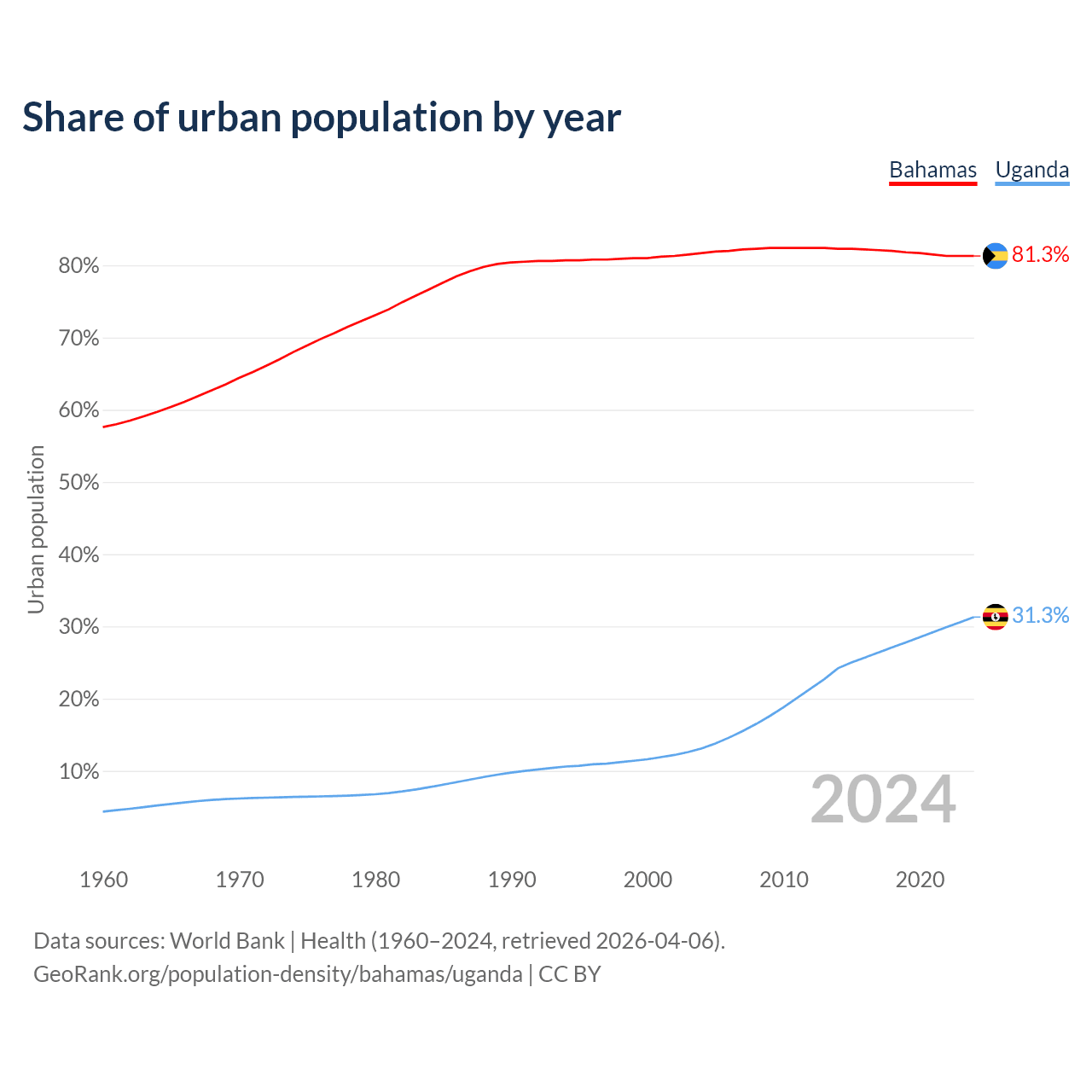 From 2004 to 2024, the share of urban population changed from 81.7% to 81.3% in the Bahamas and from 13.1% to 31.3% in Uganda.
