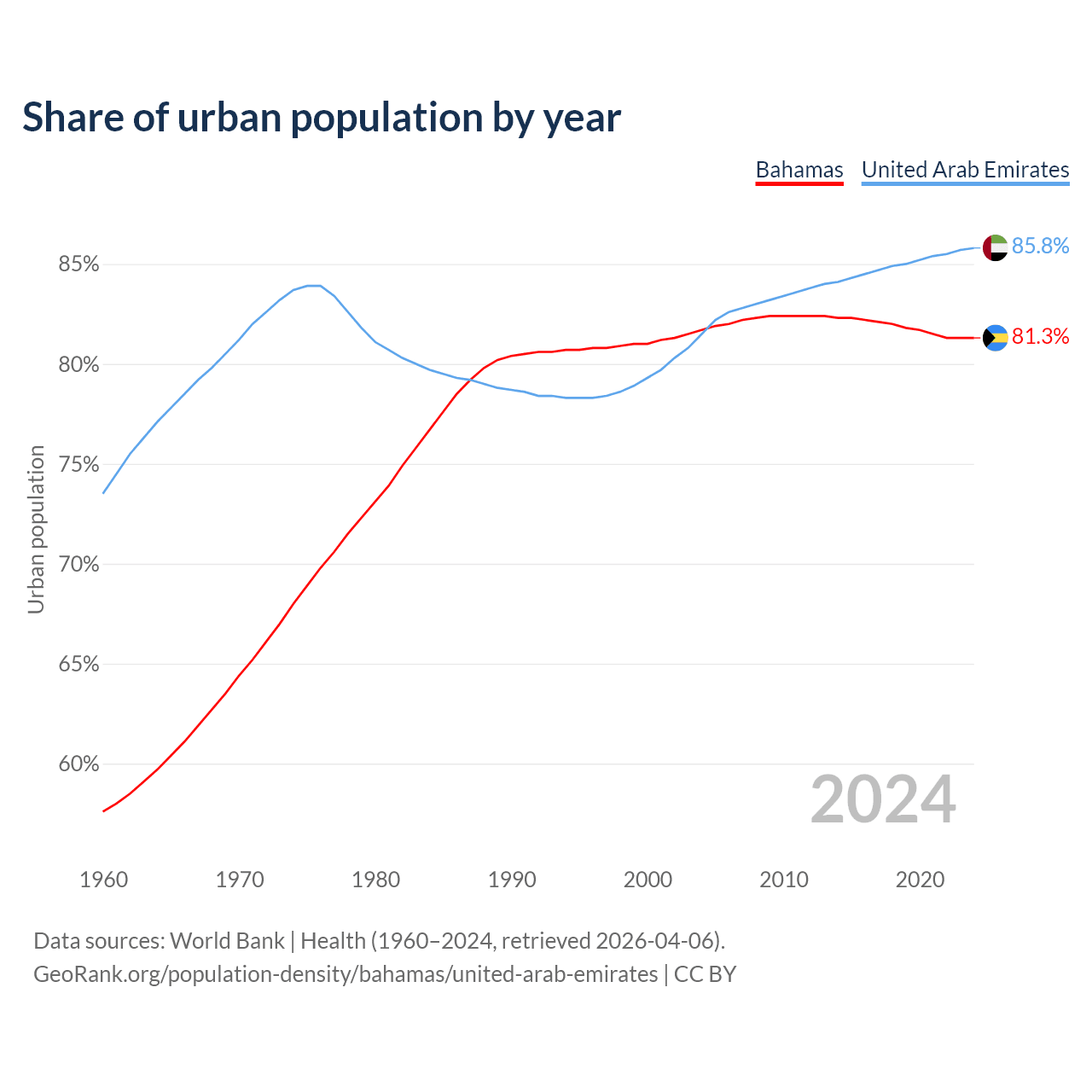 From 2004 to 2024, the share of urban population changed from 81.7% to 81.3% in the Bahamas and from 81.5% to 85.8% in the United Arab Emirates.