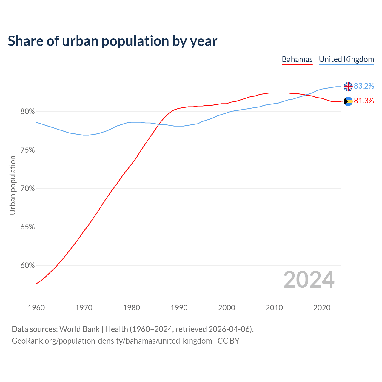 From 2004 to 2024, the share of urban population changed from 81.7% to 81.3% in the Bahamas and from 80.3% to 83.2% in the United Kingdom.