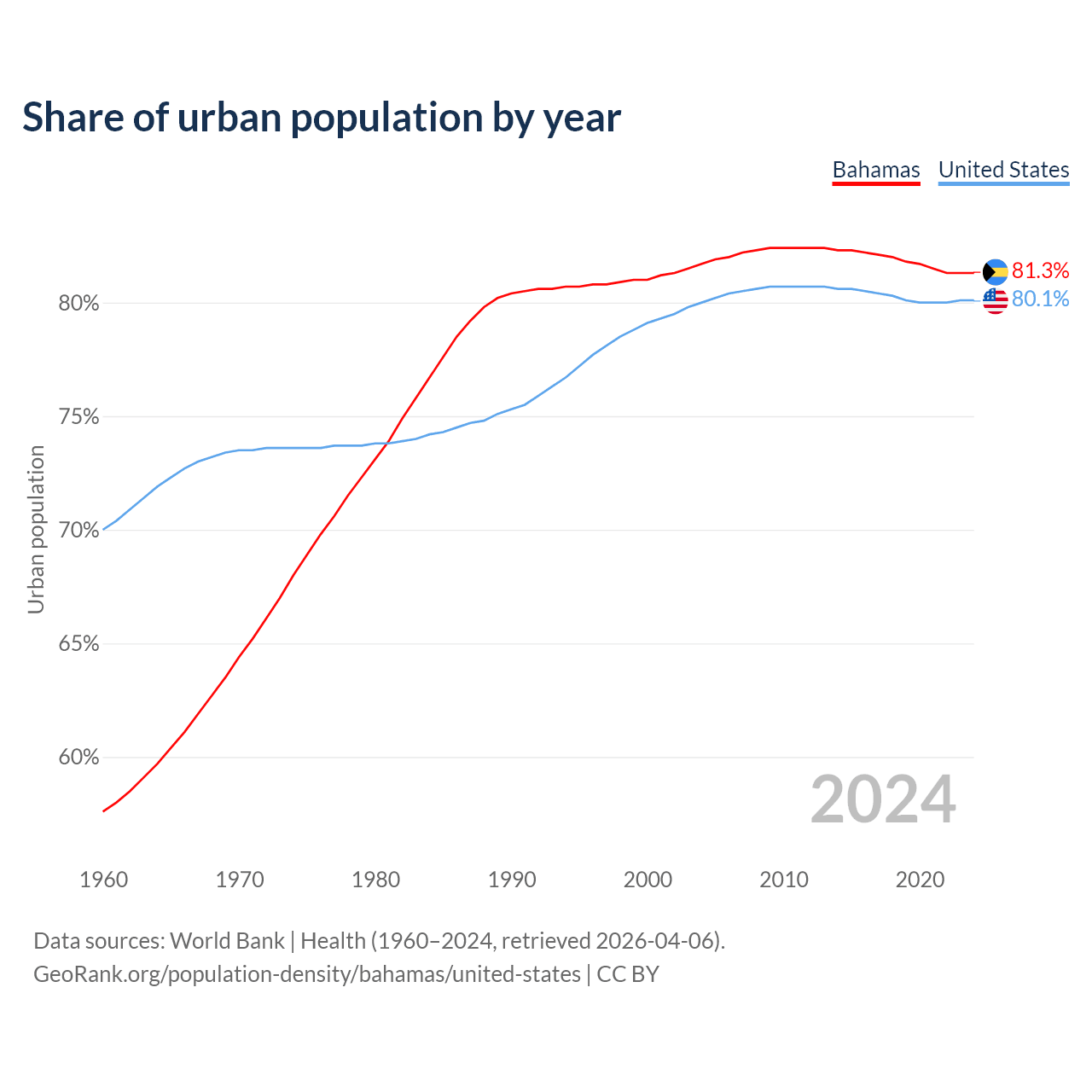 From 2004 to 2024, the share of urban population changed from 81.7% to 81.3% in the Bahamas and from 80% to 80.1% in the United States.
