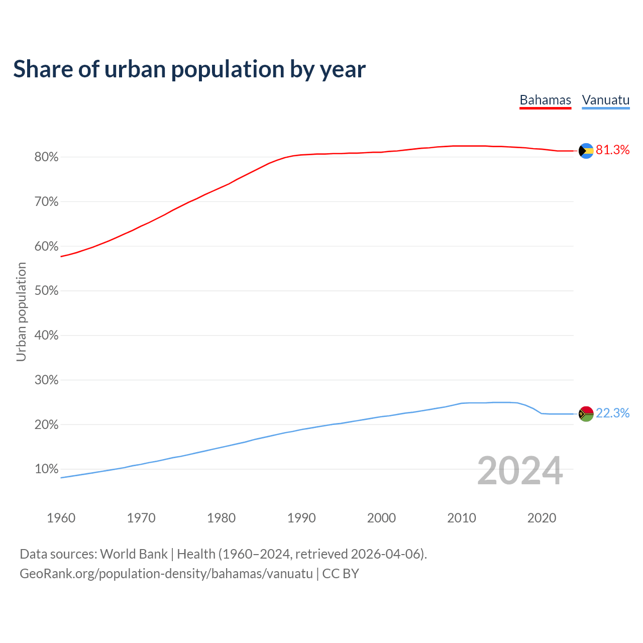 From 2004 to 2024, the share of urban population changed from 81.7% to 81.3% in the Bahamas and from 22.7% to 22.3% in Vanuatu.