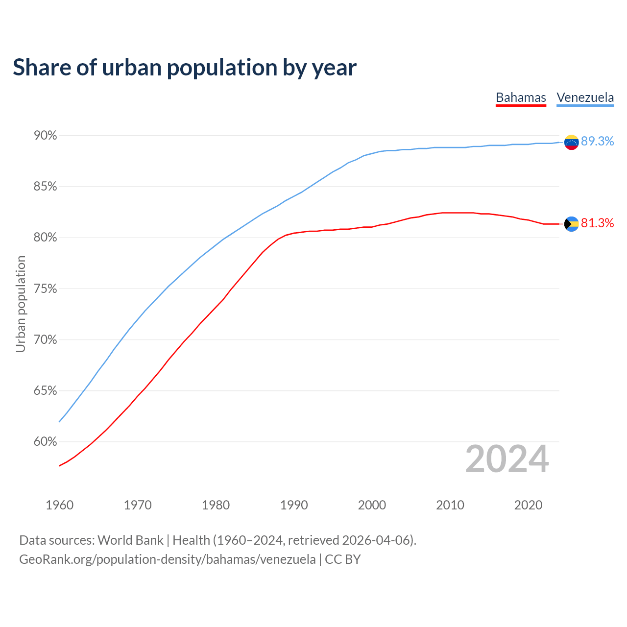 From 2004 to 2024, the share of urban population changed from 81.7% to 81.3% in the Bahamas and from 88.6% to 89.3% in Venezuela.
