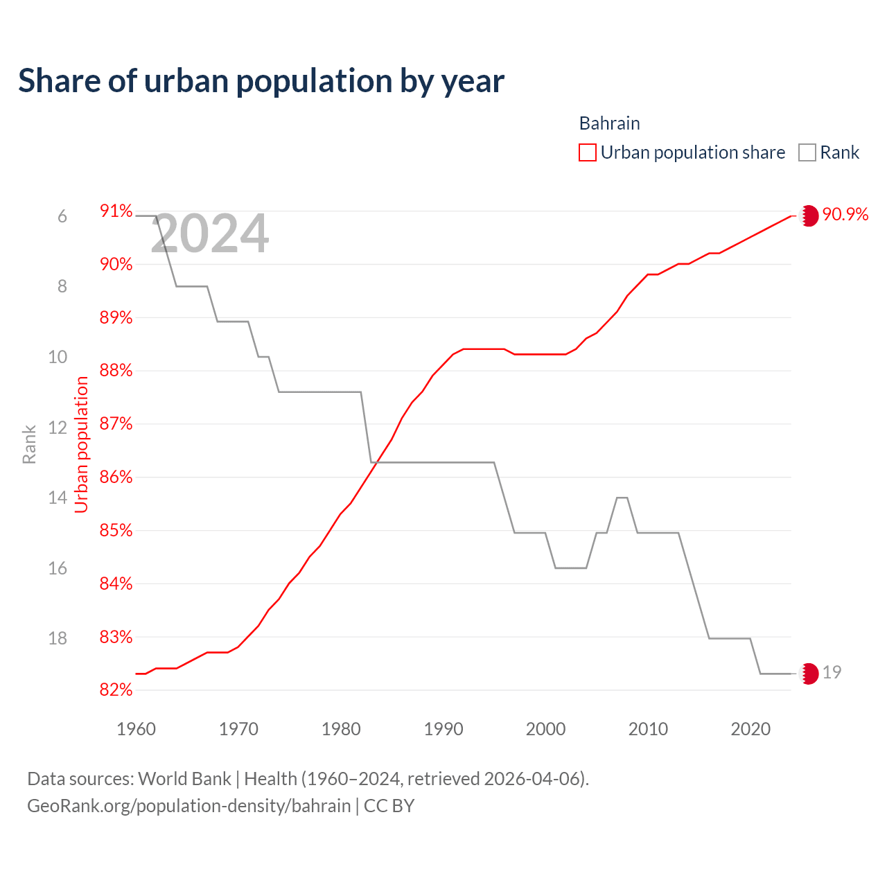 This chart shows the share of urban population in Bahrain from 1960 to 2024: 82.3% lived in urban areas in 1960, 88.3% in 2000, and 90.9% in 2024.