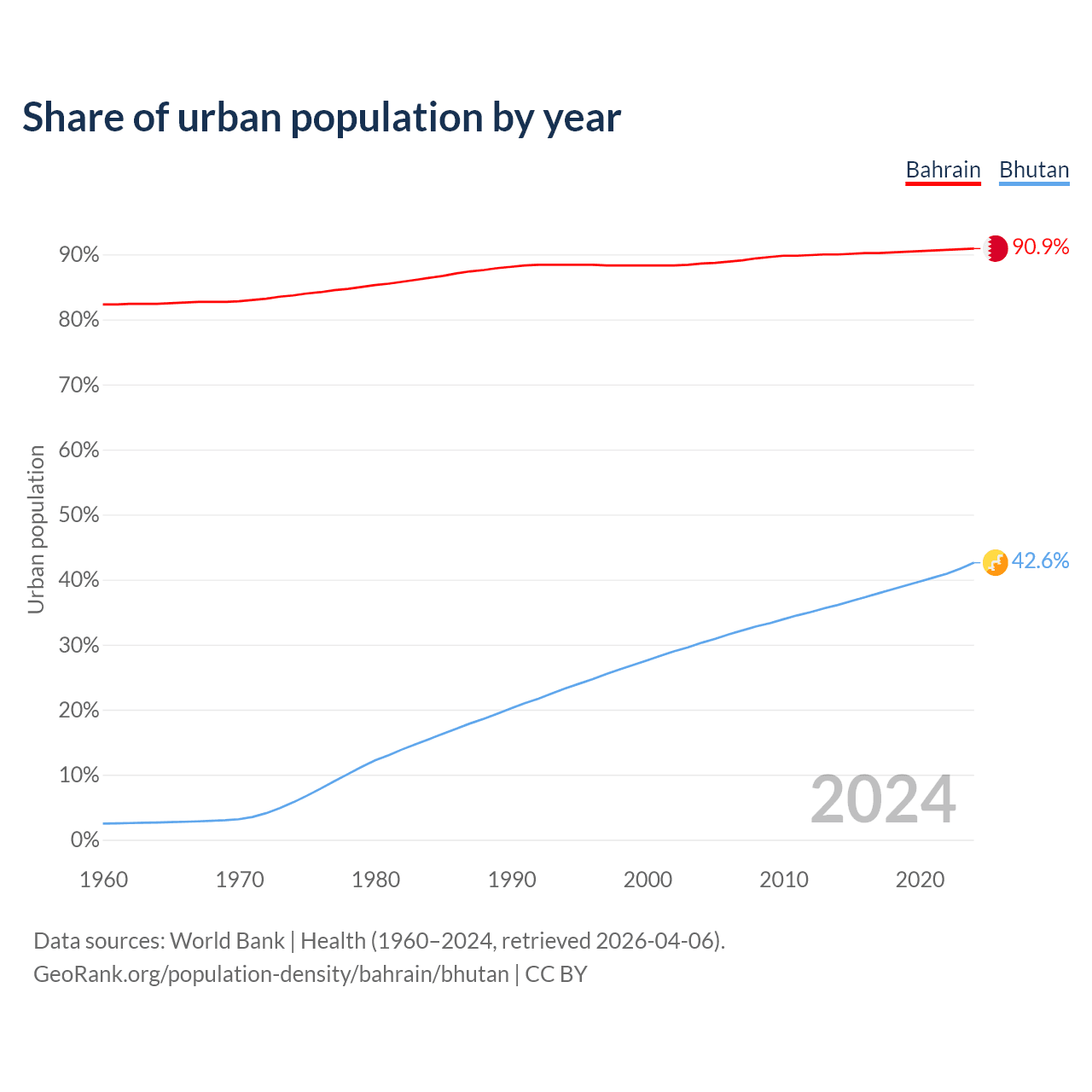 From 2004 to 2024, the share of urban population changed from 88.6% to 90.9% in Bahrain and from 30.3% to 42.6% in Bhutan.