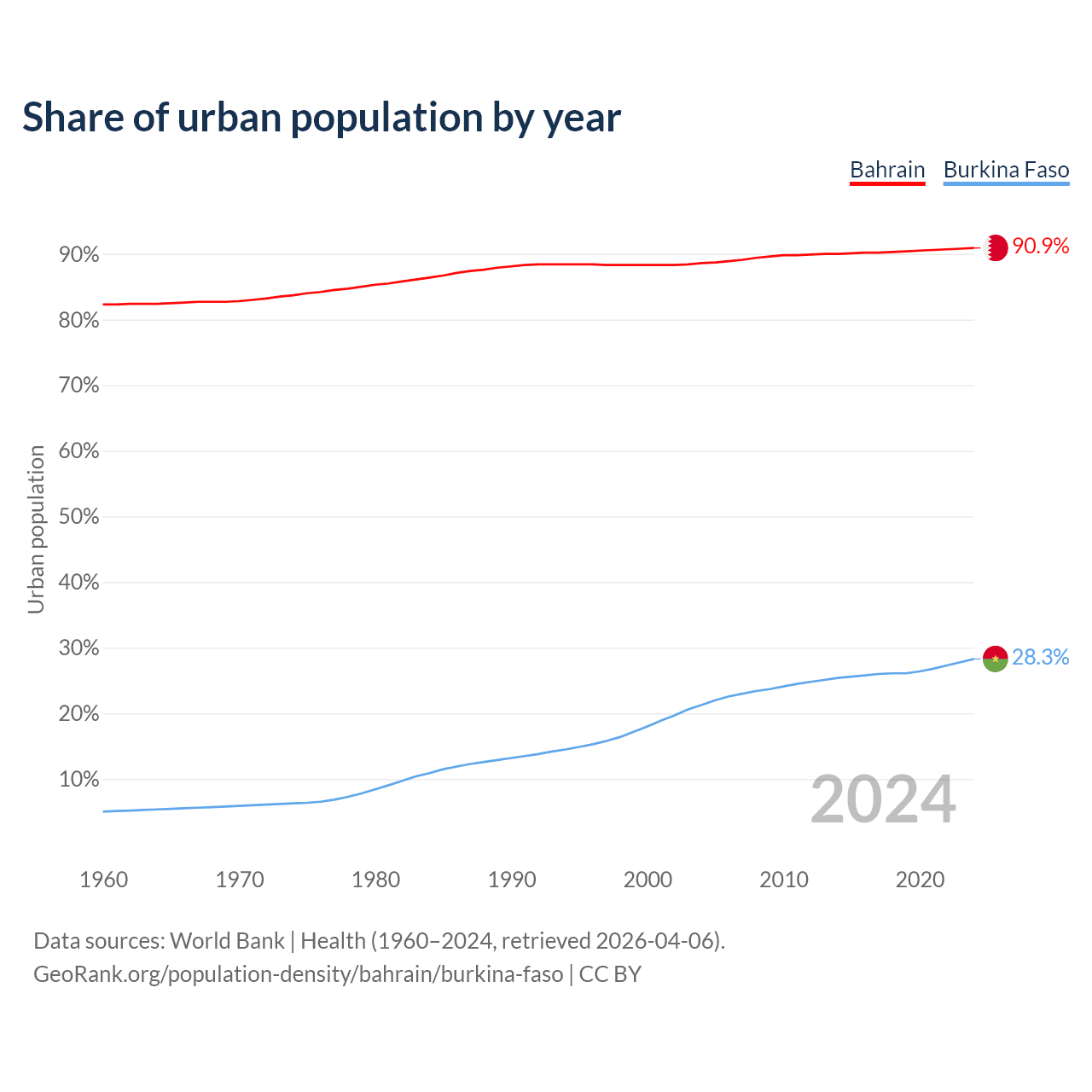 From 2004 to 2024, the share of urban population changed from 88.6% to 90.9% in Bahrain and from 21.3% to 28.3% in Burkina Faso.