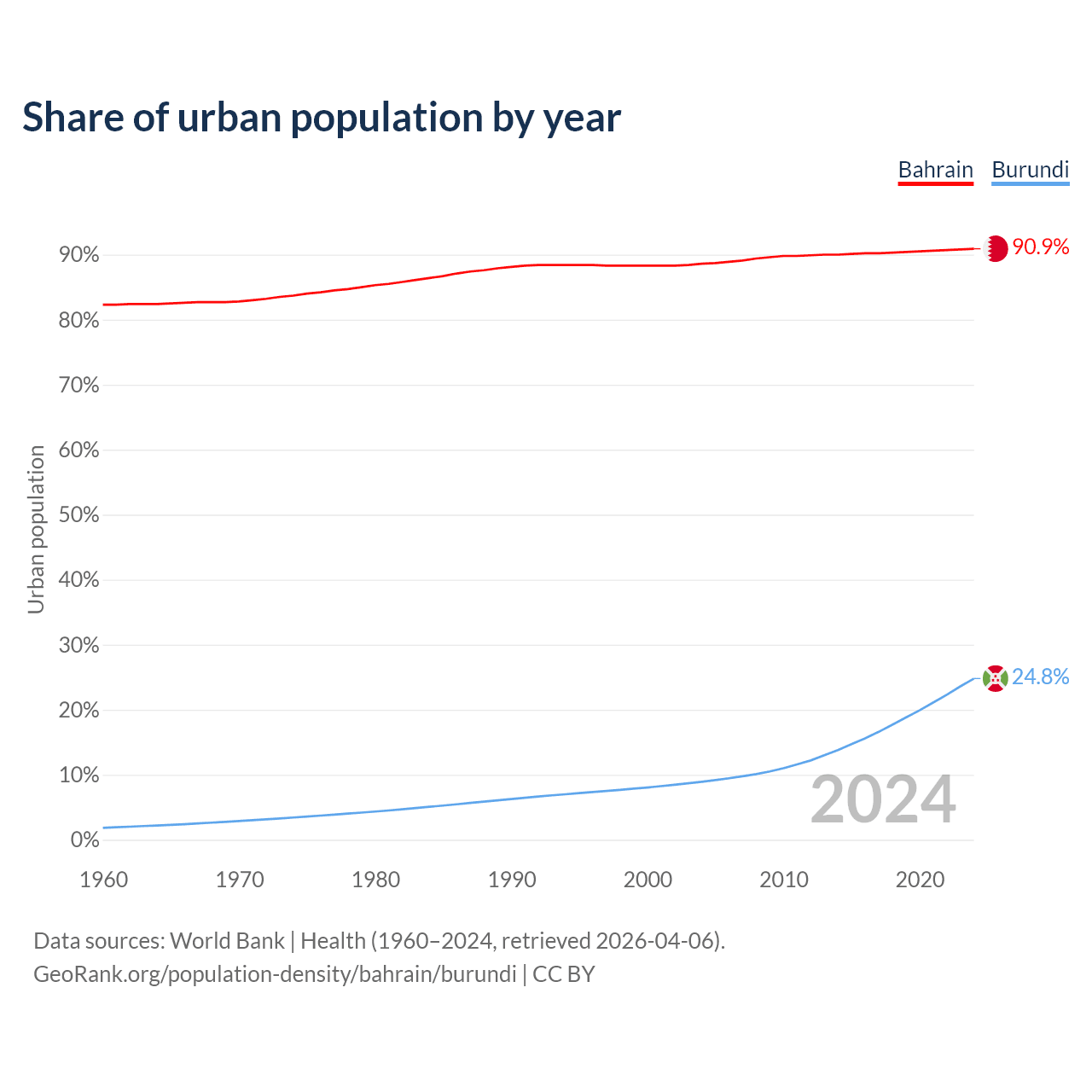 From 2004 to 2024, the share of urban population changed from 88.6% to 90.9% in Bahrain and from 8.92% to 24.8% in Burundi.