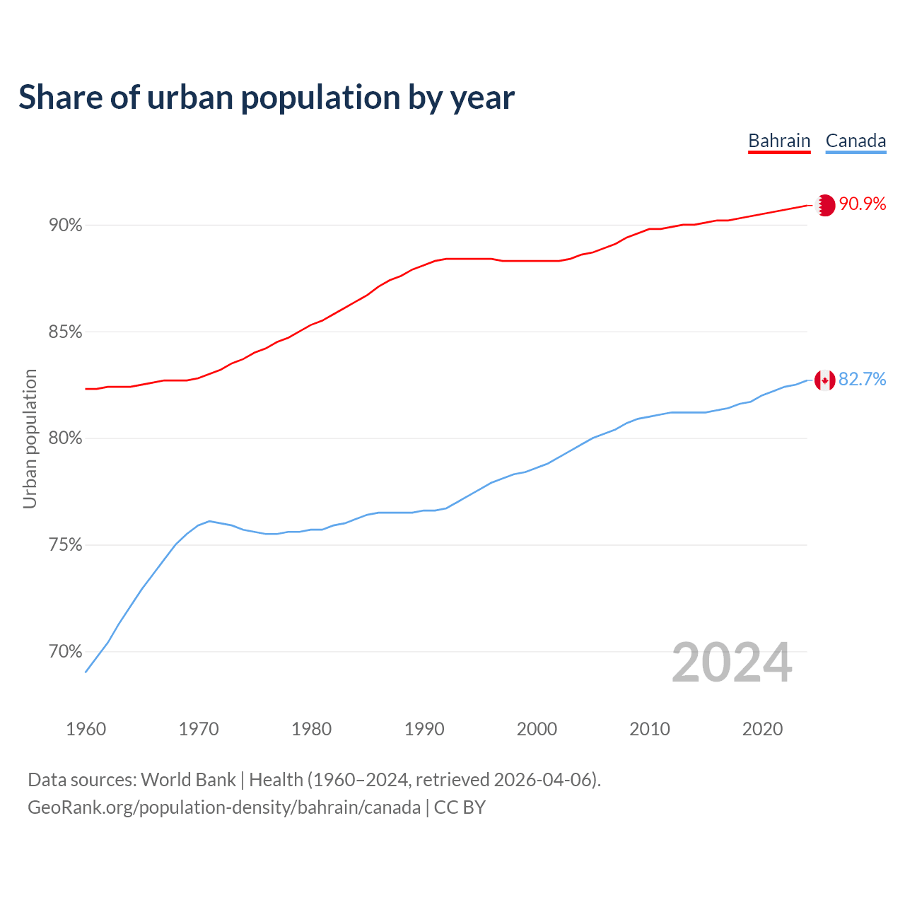 From 2004 to 2024, the share of urban population changed from 88.6% to 90.9% in Bahrain and from 79.7% to 82.7% in Canada.