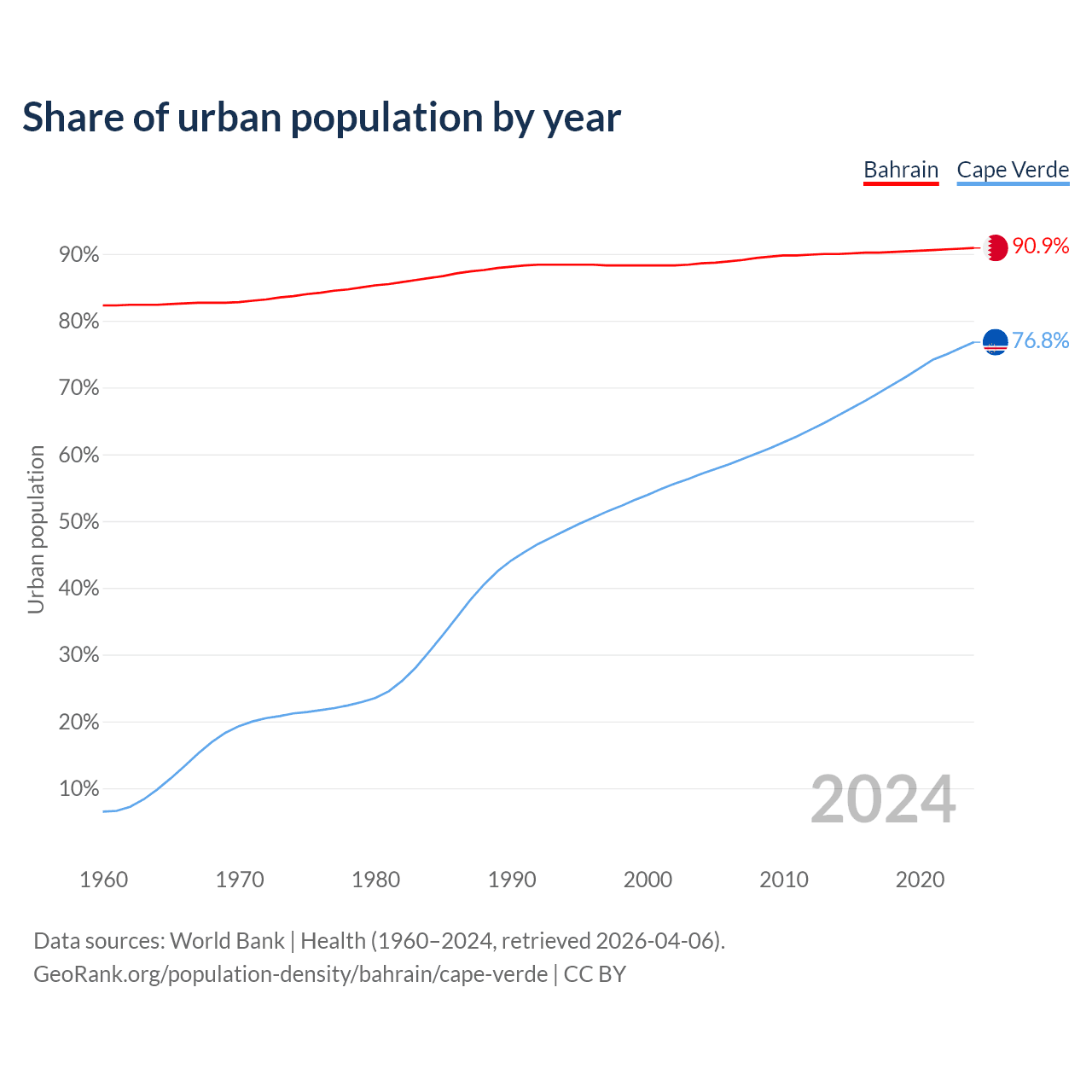From 2004 to 2024, the share of urban population changed from 88.6% to 90.9% in Bahrain and from 57.1% to 76.8% in Cape Verde.