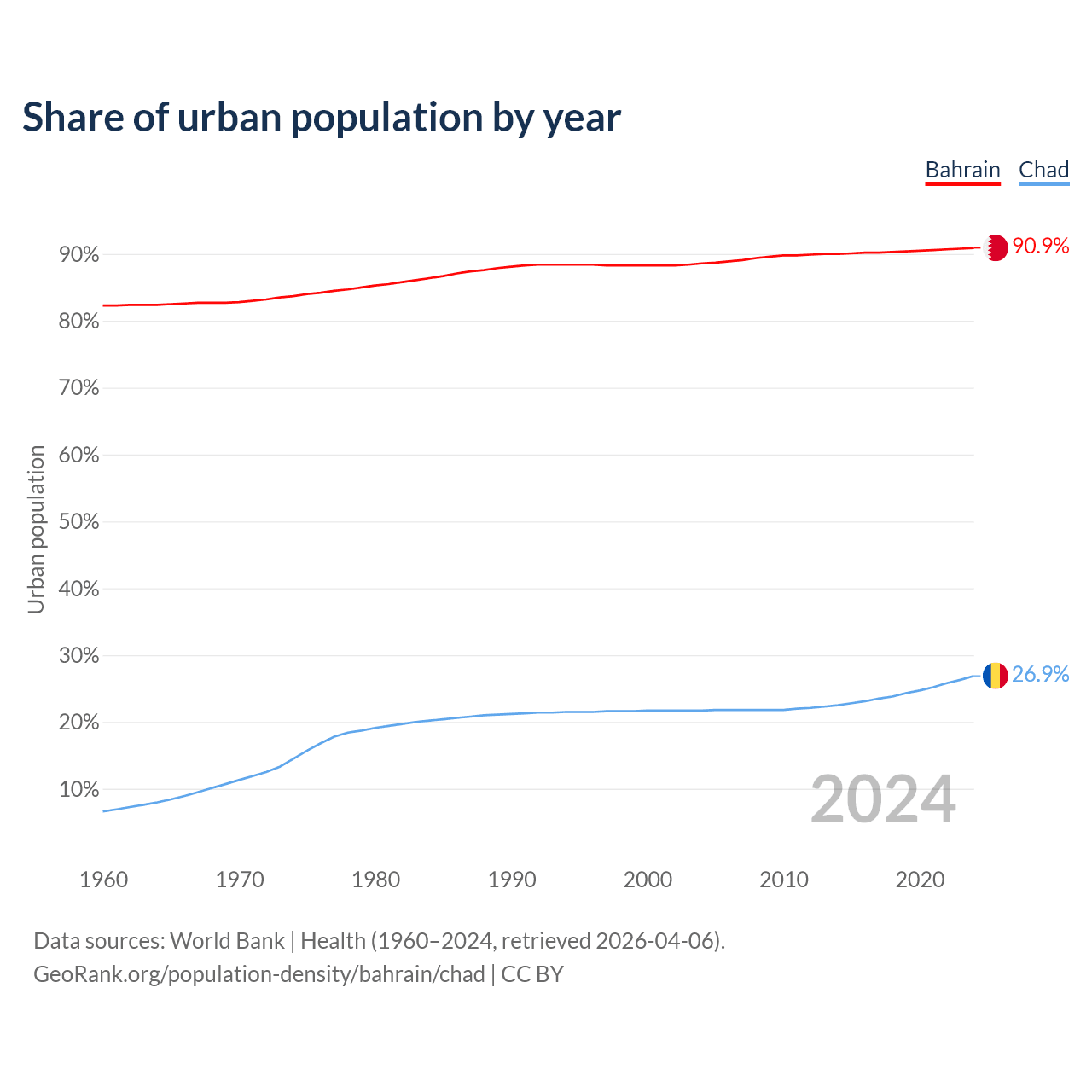 From 2004 to 2024, the share of urban population changed from 88.6% to 90.9% in Bahrain and from 21.7% to 26.9% in Chad.