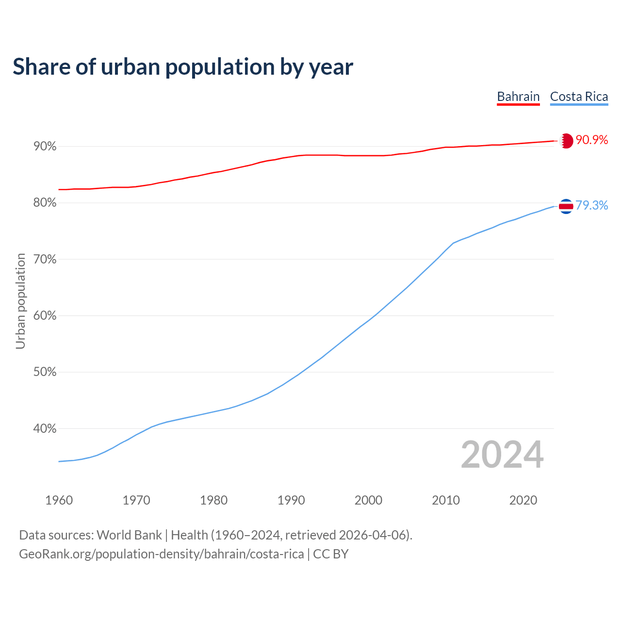 From 2004 to 2024, the share of urban population changed from 88.6% to 90.9% in Bahrain and from 63.7% to 79.3% in Costa Rica.