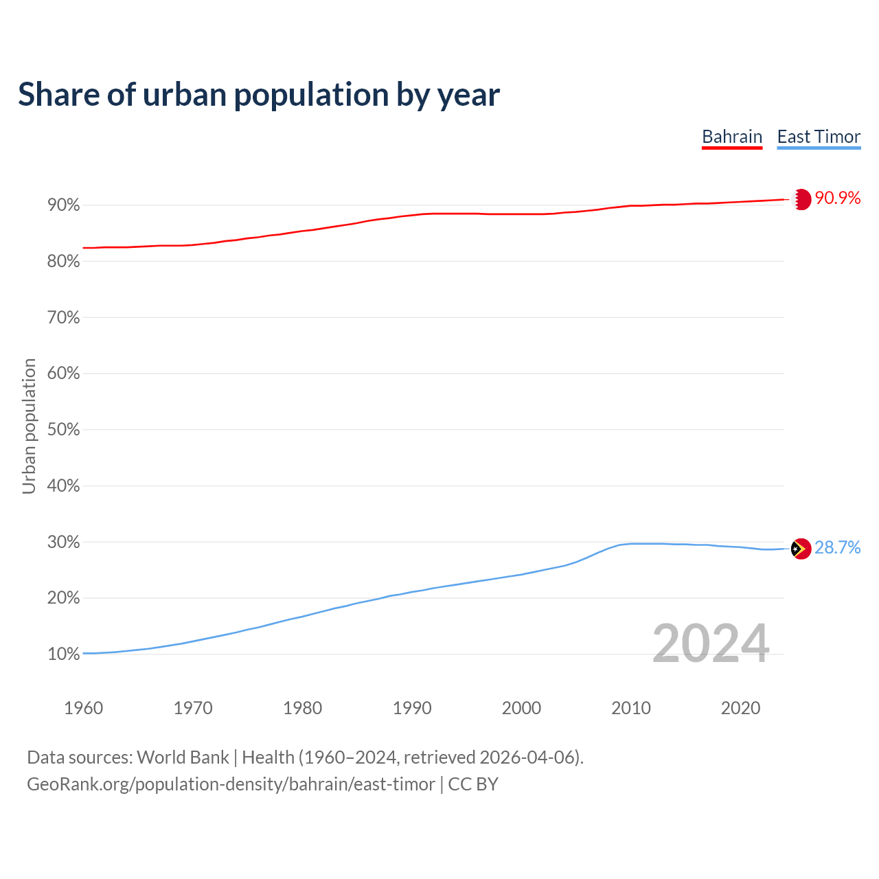 From 2004 to 2024, the share of urban population changed from 88.6% to 90.9% in Bahrain and from 25.7% to 28.7% in East Timor.