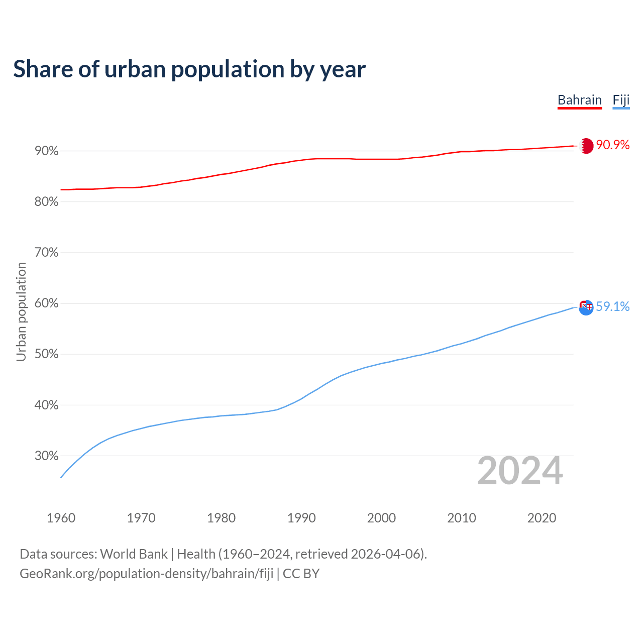 From 2004 to 2024, the share of urban population changed from 88.6% to 90.9% in Bahrain and from 49.5% to 59.1% in Fiji.