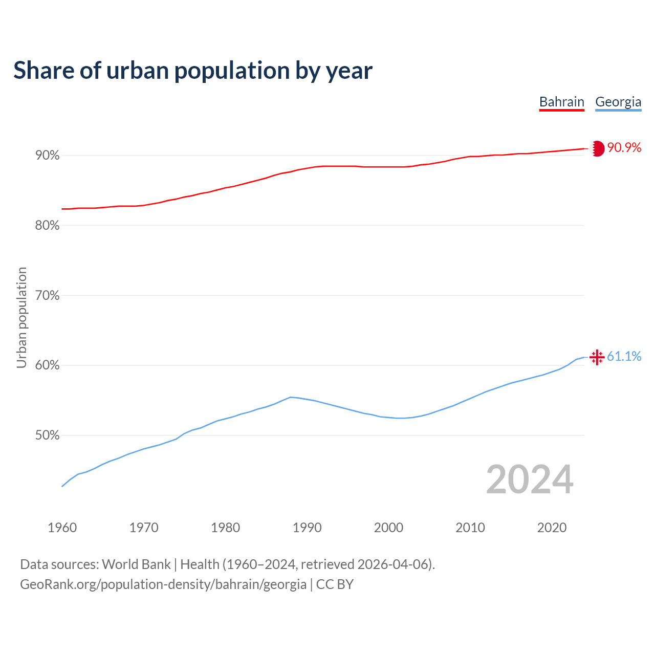 From 2004 to 2024, the share of urban population changed from 88.6% to 90.9% in Bahrain and from 52.7% to 61.1% in Georgia.