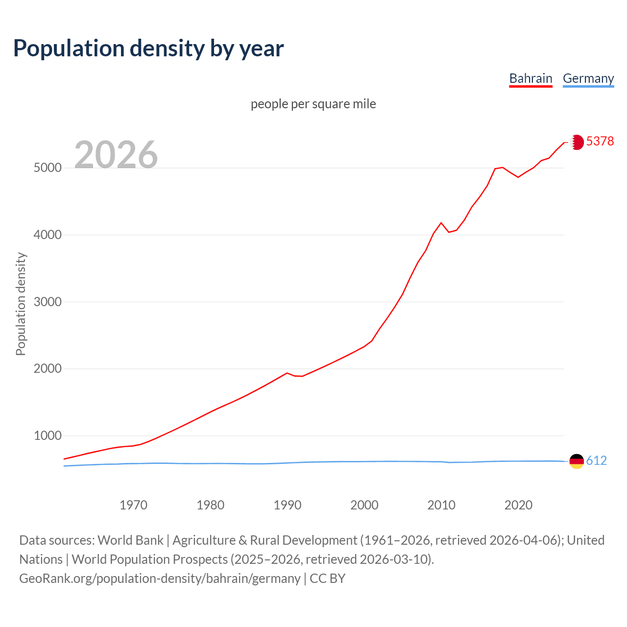 From 2006 to 2026, population density in Bahrain increased by 60%, compared to a 0.04% growth in Germany.