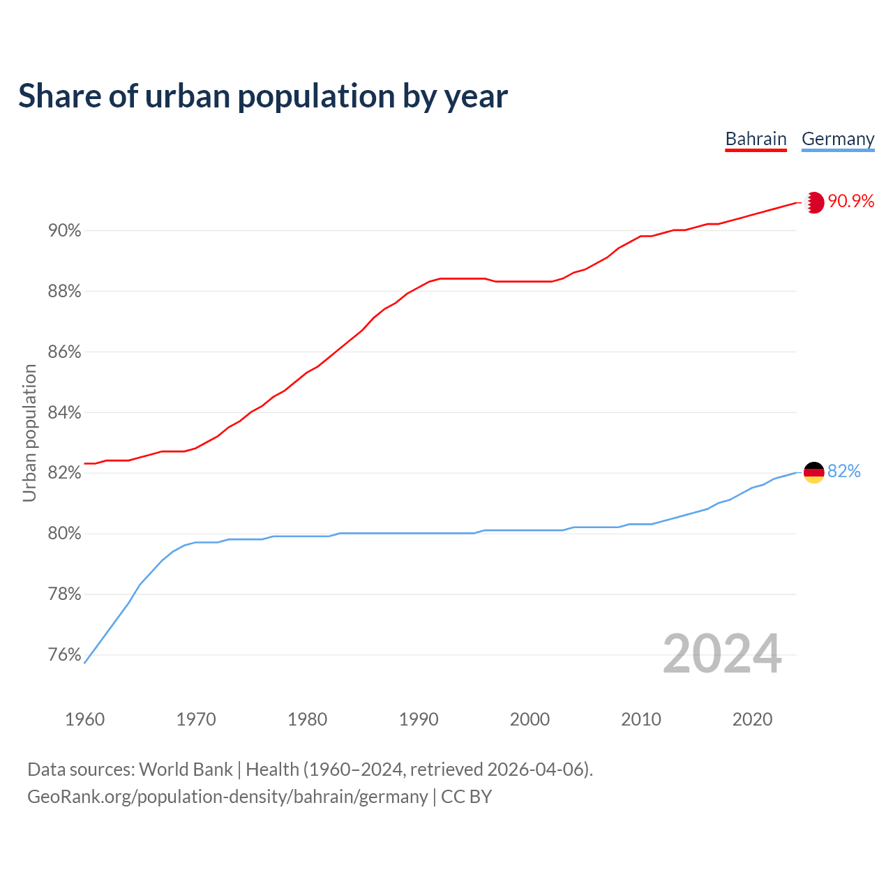From 2004 to 2024, the share of urban population changed from 88.6% to 90.9% in Bahrain and from 80.2% to 82% in Germany.