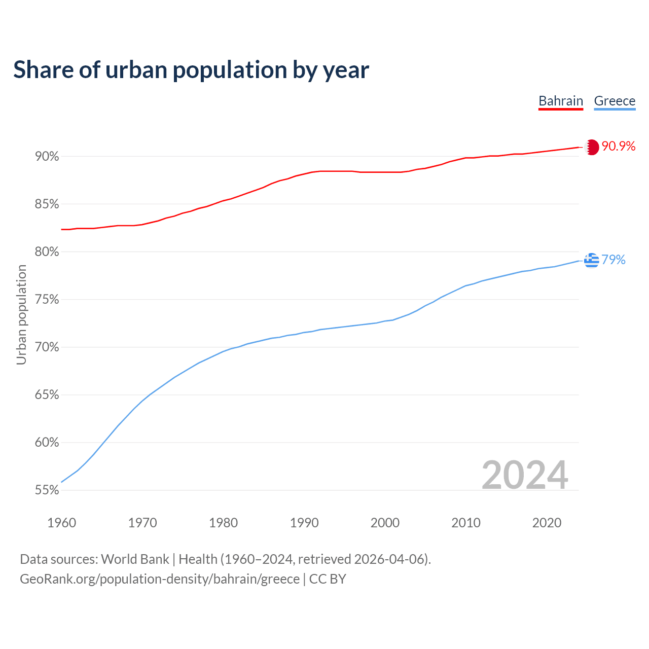 From 2004 to 2024, the share of urban population changed from 88.6% to 90.9% in Bahrain and from 73.8% to 79% in Greece.