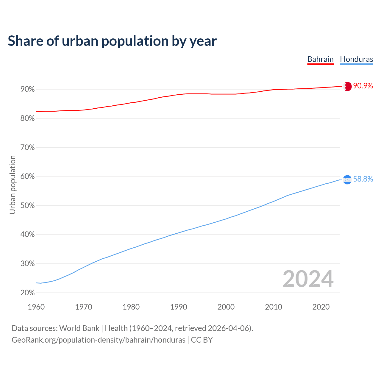 From 2004 to 2024, the share of urban population changed from 88.6% to 90.9% in Bahrain and from 47.6% to 58.8% in Honduras.