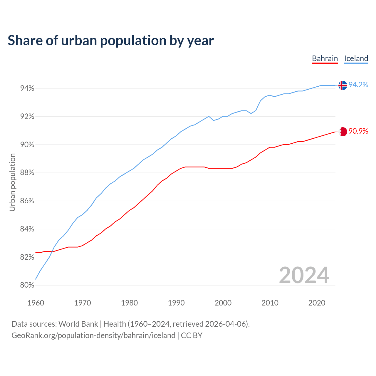 From 2004 to 2024, the share of urban population changed from 88.6% to 90.9% in Bahrain and from 92.4% to 94.2% in Iceland.