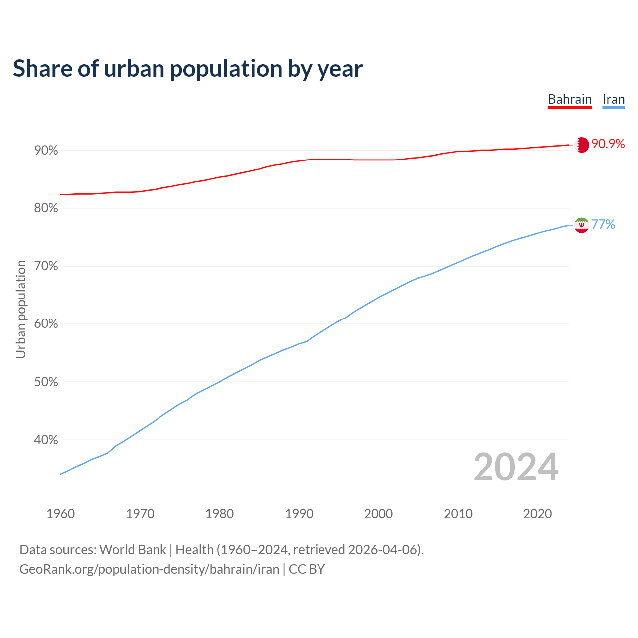 From 2004 to 2024, the share of urban population changed from 88.6% to 90.9% in Bahrain and from 67.3% to 77% in Iran.