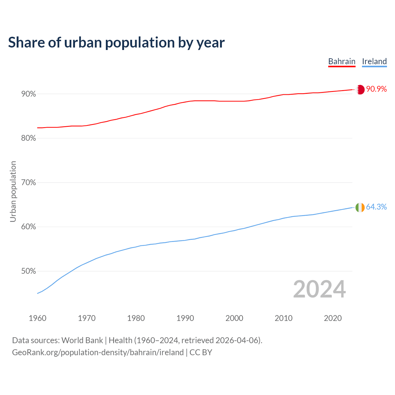 From 2004 to 2024, the share of urban population changed from 88.6% to 90.9% in Bahrain and from 60.2% to 64.3% in Ireland.