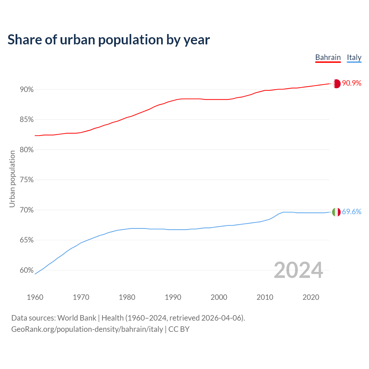 From 2004 to 2024, the share of urban population changed from 88.6% to 90.9% in Bahrain and from 67.5% to 69.6% in Italy.