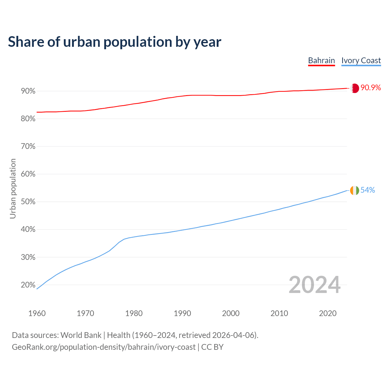 From 2004 to 2024, the share of urban population changed from 88.6% to 90.9% in Bahrain and from 44.7% to 54% in Ivory Coast.