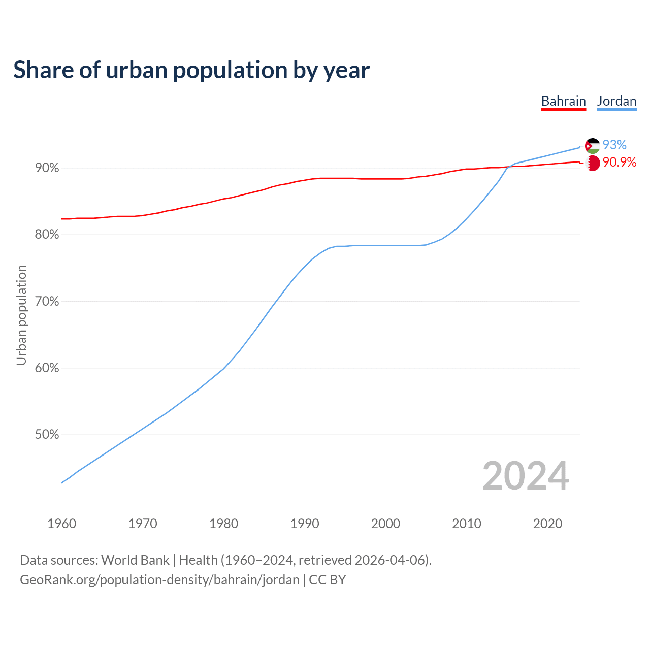 From 2004 to 2024, the share of urban population changed from 88.6% to 90.9% in Bahrain and from 78.3% to 93% in Jordan.