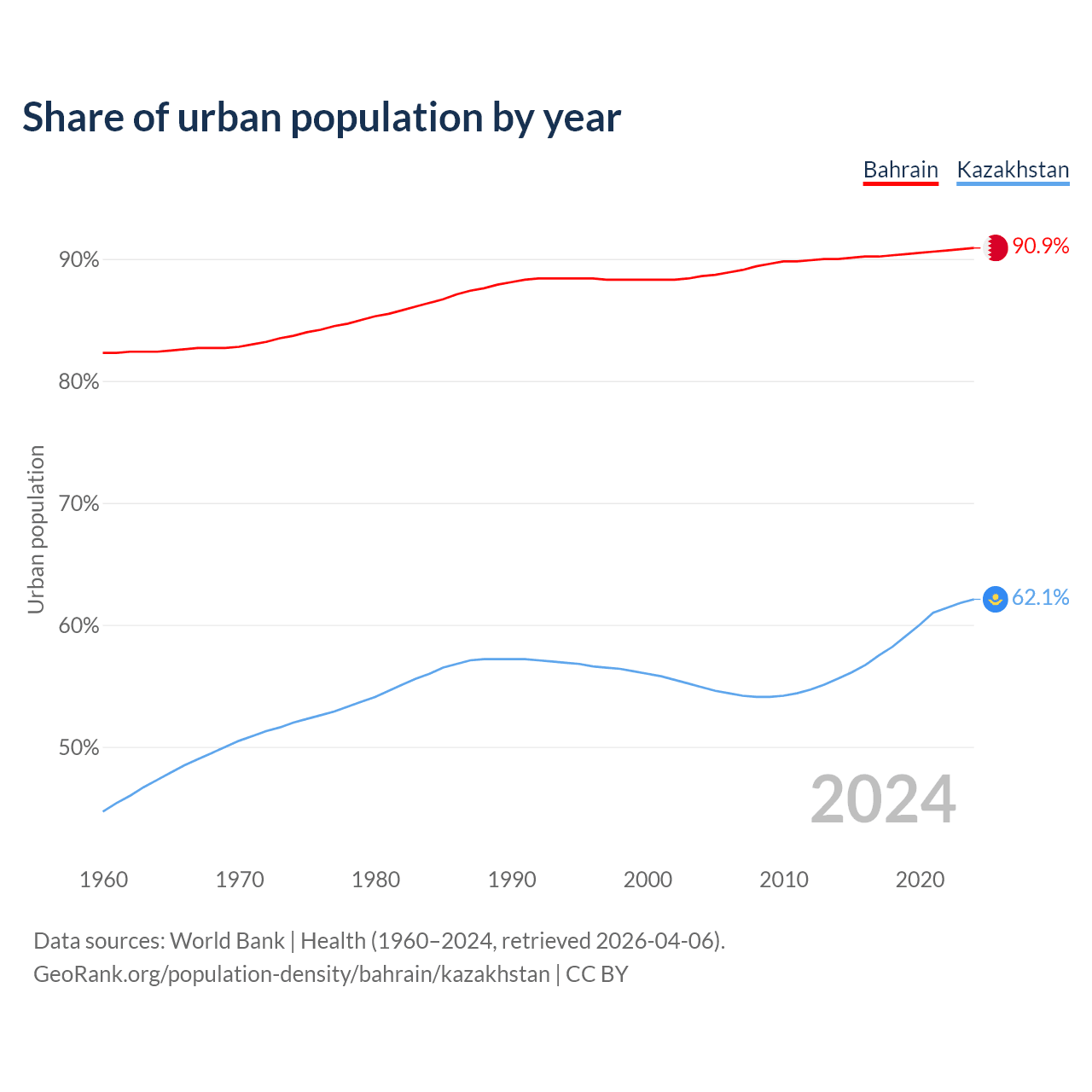 From 2004 to 2024, the share of urban population changed from 88.6% to 90.9% in Bahrain and from 54.9% to 62.1% in Kazakhstan.