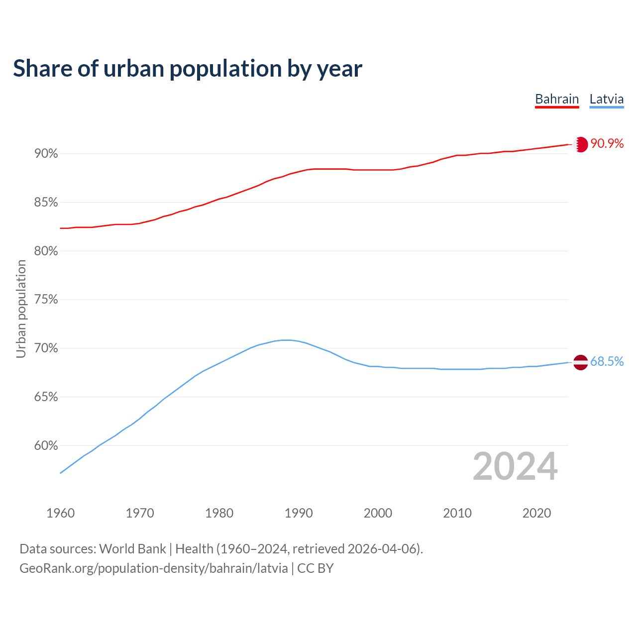 From 2004 to 2024, the share of urban population changed from 88.6% to 90.9% in Bahrain and from 67.9% to 68.5% in Latvia.