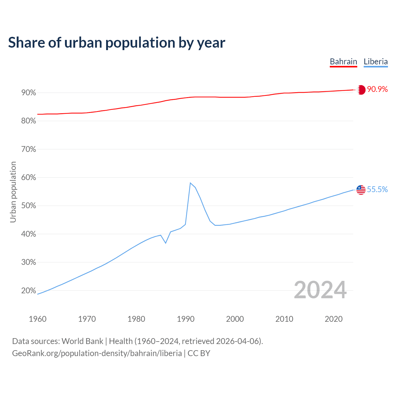 From 2004 to 2024, the share of urban population changed from 88.6% to 90.9% in Bahrain and from 45.4% to 55.5% in Liberia.