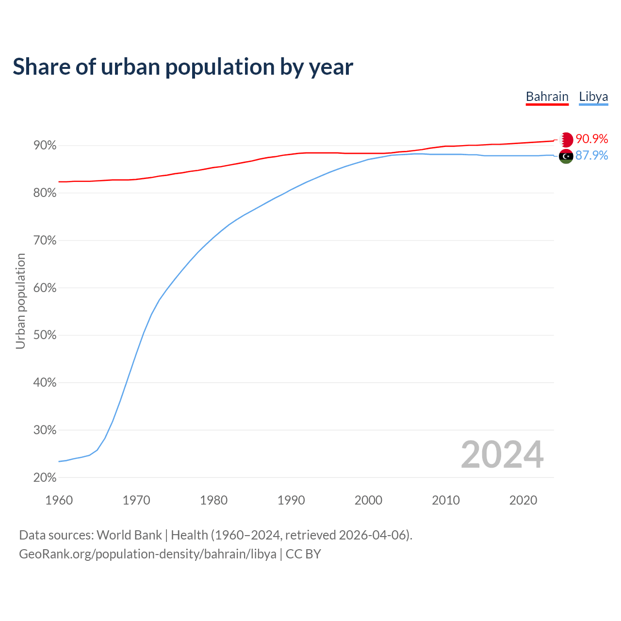 From 2004 to 2024, the share of urban population changed from 88.6% to 90.9% in Bahrain and from 88% to 87.9% in Libya.