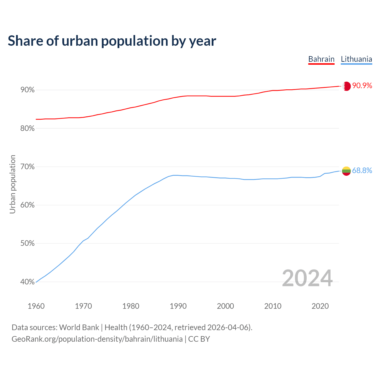 From 2004 to 2024, the share of urban population changed from 88.6% to 90.9% in Bahrain and from 66.6% to 68.8% in Lithuania.
