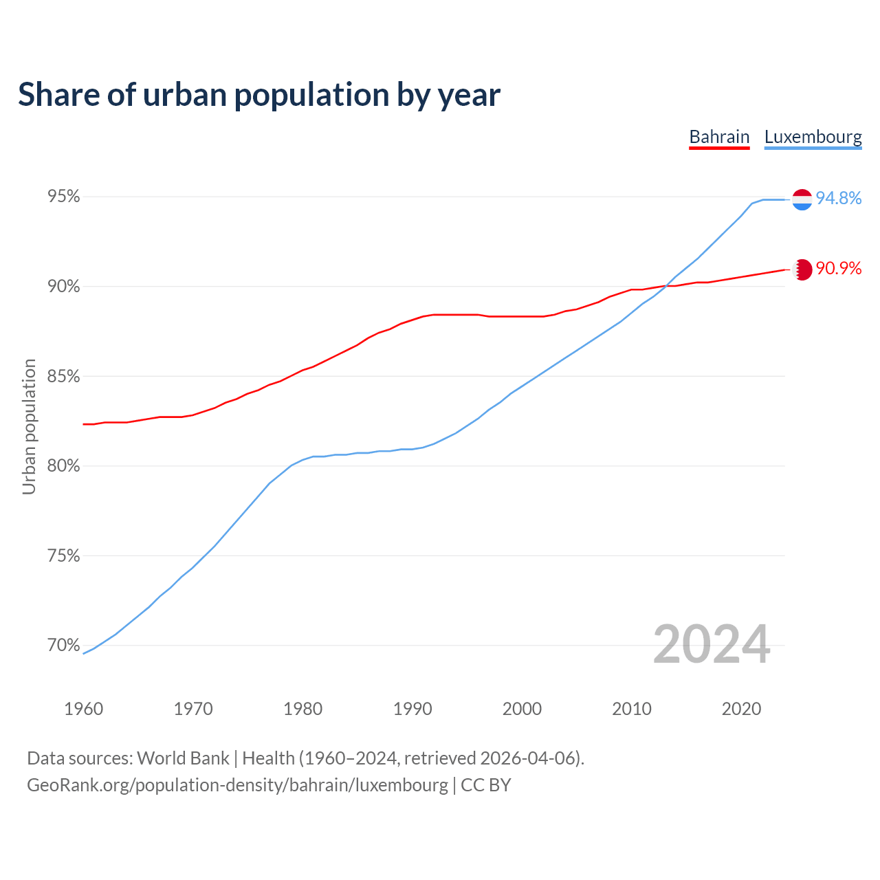 From 2004 to 2024, the share of urban population changed from 88.6% to 90.9% in Bahrain and from 86% to 94.8% in Luxembourg.