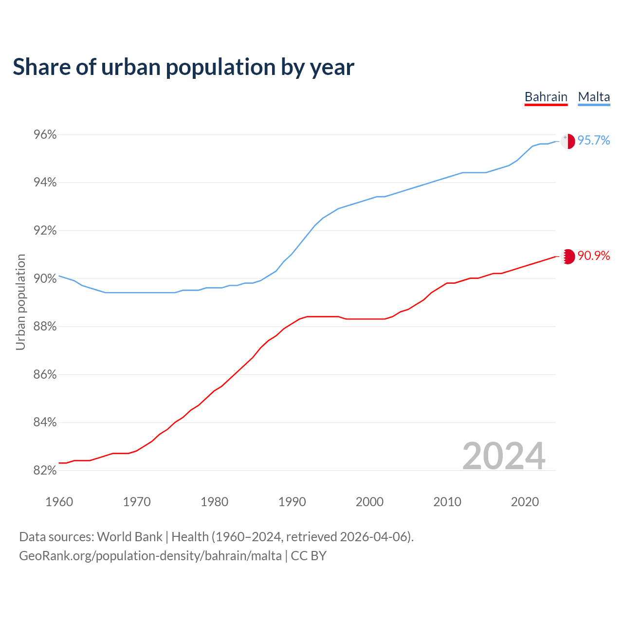 From 2004 to 2024, the share of urban population changed from 88.6% to 90.9% in Bahrain and from 93.6% to 95.7% in Malta.