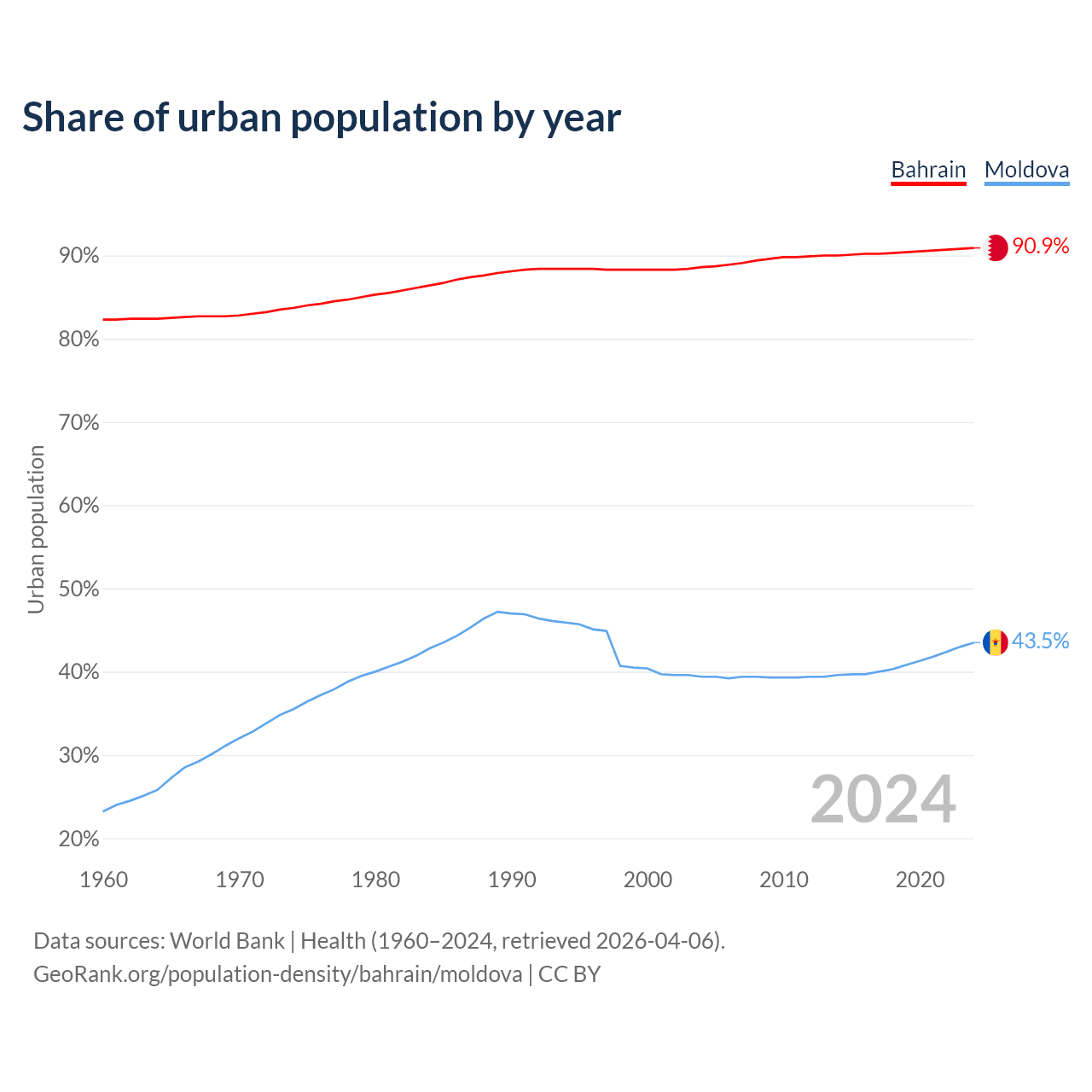 From 2004 to 2024, the share of urban population changed from 88.6% to 90.9% in Bahrain and from 39.4% to 43.5% in Moldova.