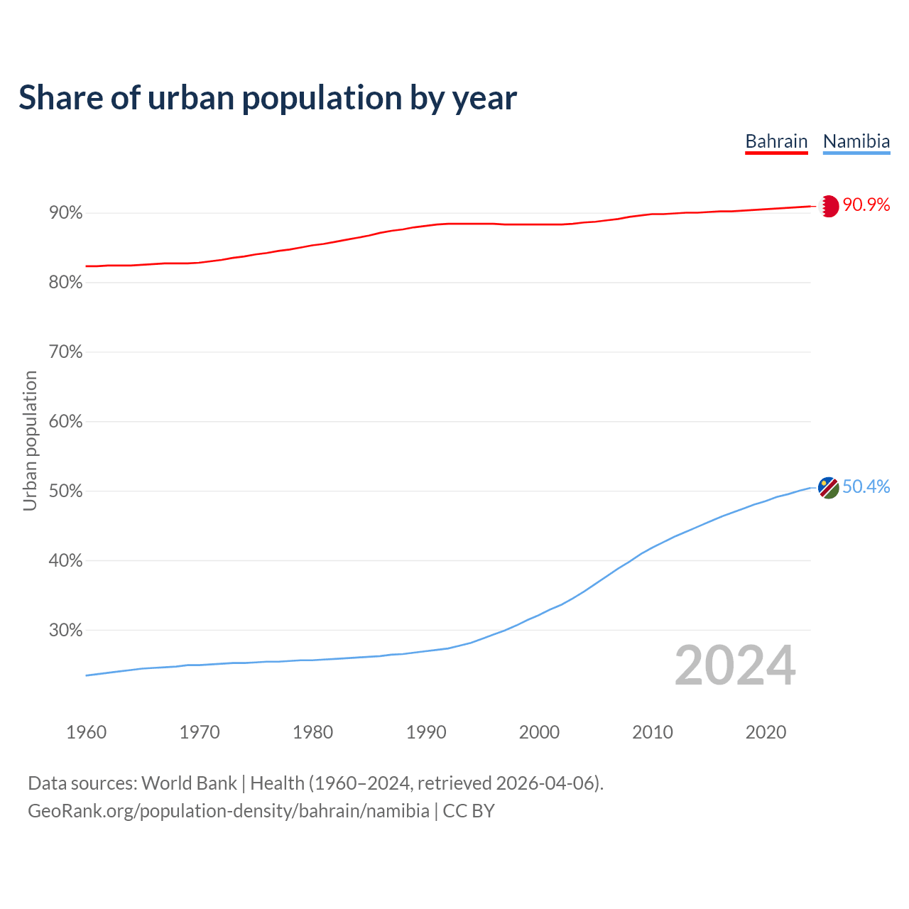 From 2004 to 2024, the share of urban population changed from 88.6% to 90.9% in Bahrain and from 35.5% to 50.4% in Namibia.