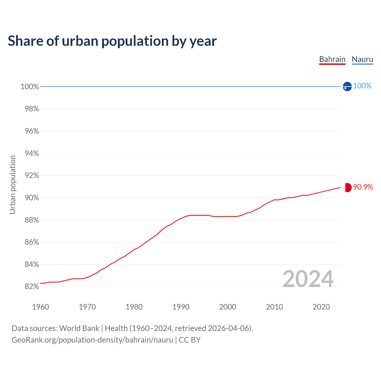 From 2004 to 2024, the share of urban population changed from 88.6% to 90.9% in Bahrain and from 100% to 100% in Nauru.