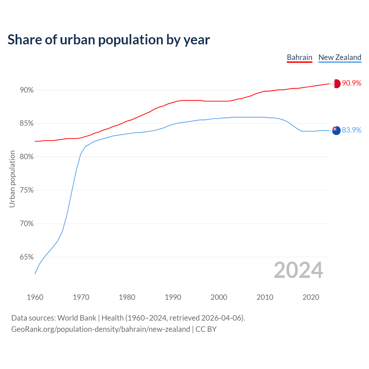 From 2004 to 2024, the share of urban population changed from 88.6% to 90.9% in Bahrain and from 85.9% to 83.9% in New Zealand.