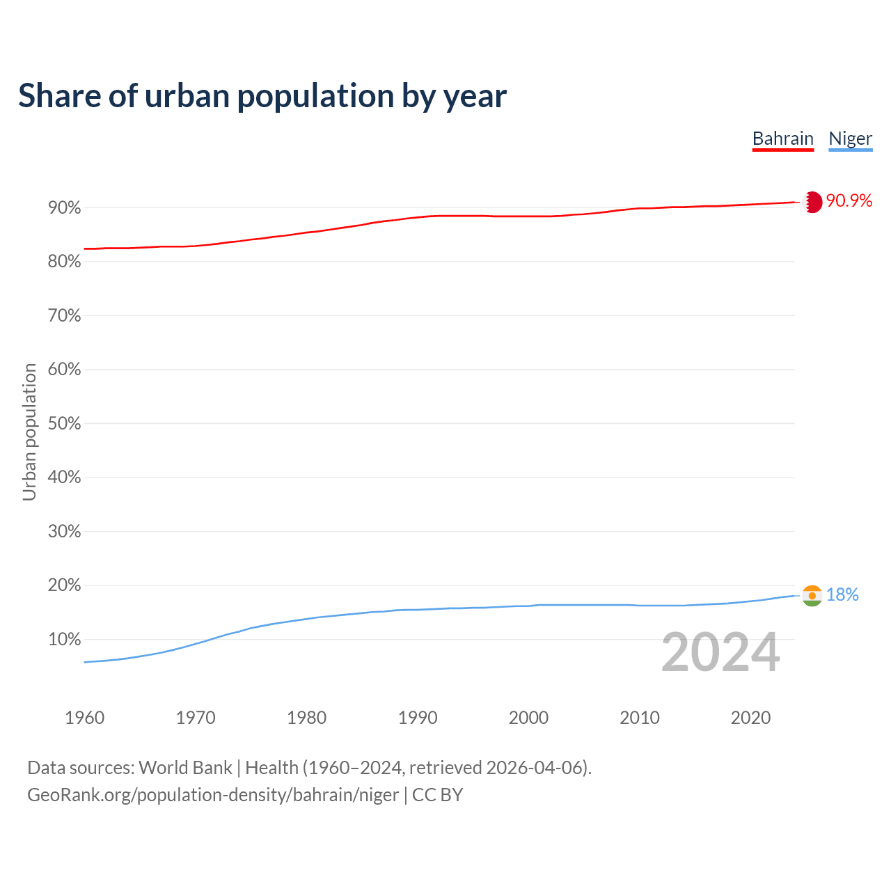 From 2004 to 2024, the share of urban population changed from 88.6% to 90.9% in Bahrain and from 16.3% to 18% in Niger.