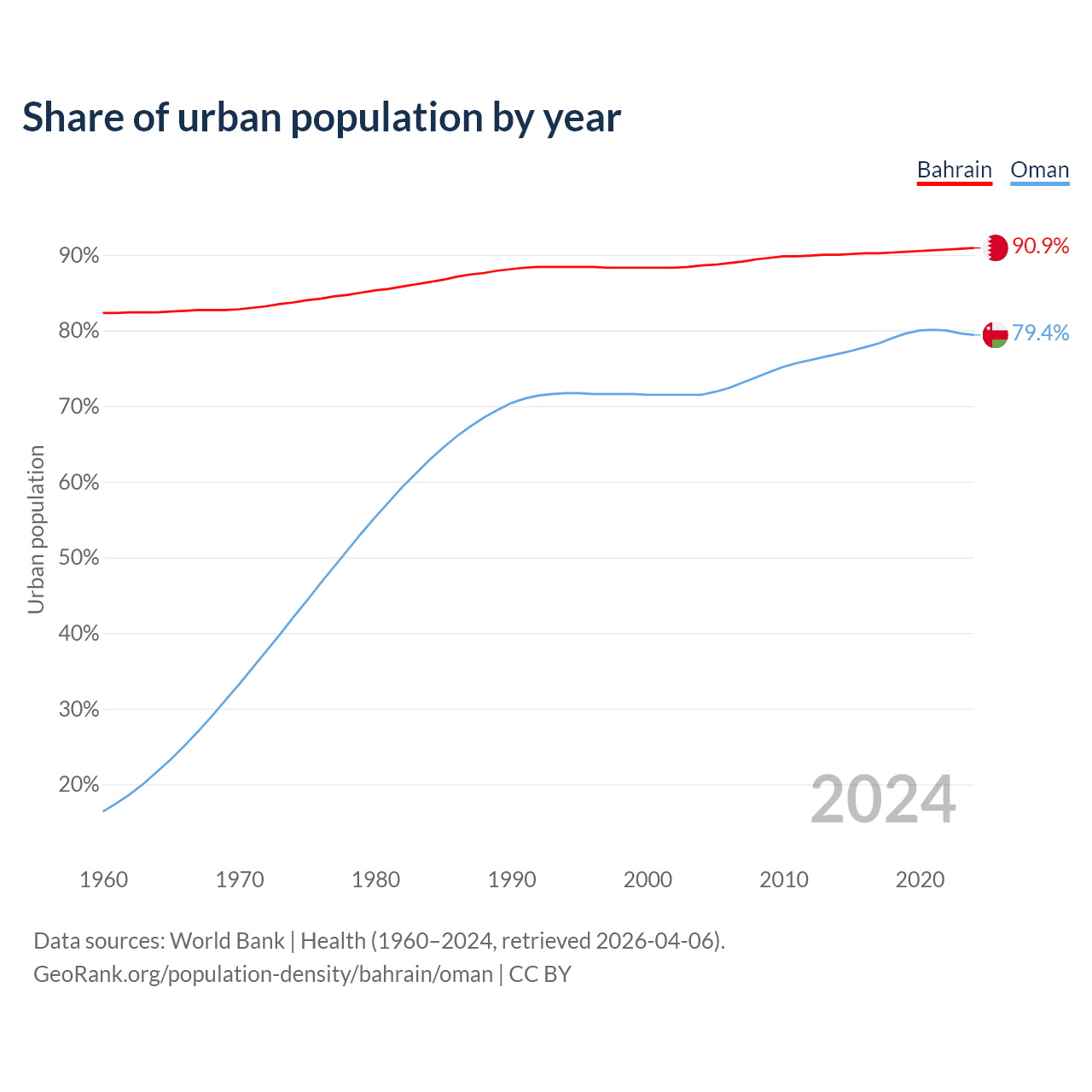 From 2004 to 2024, the share of urban population changed from 88.6% to 90.9% in Bahrain and from 71.5% to 79.4% in Oman.