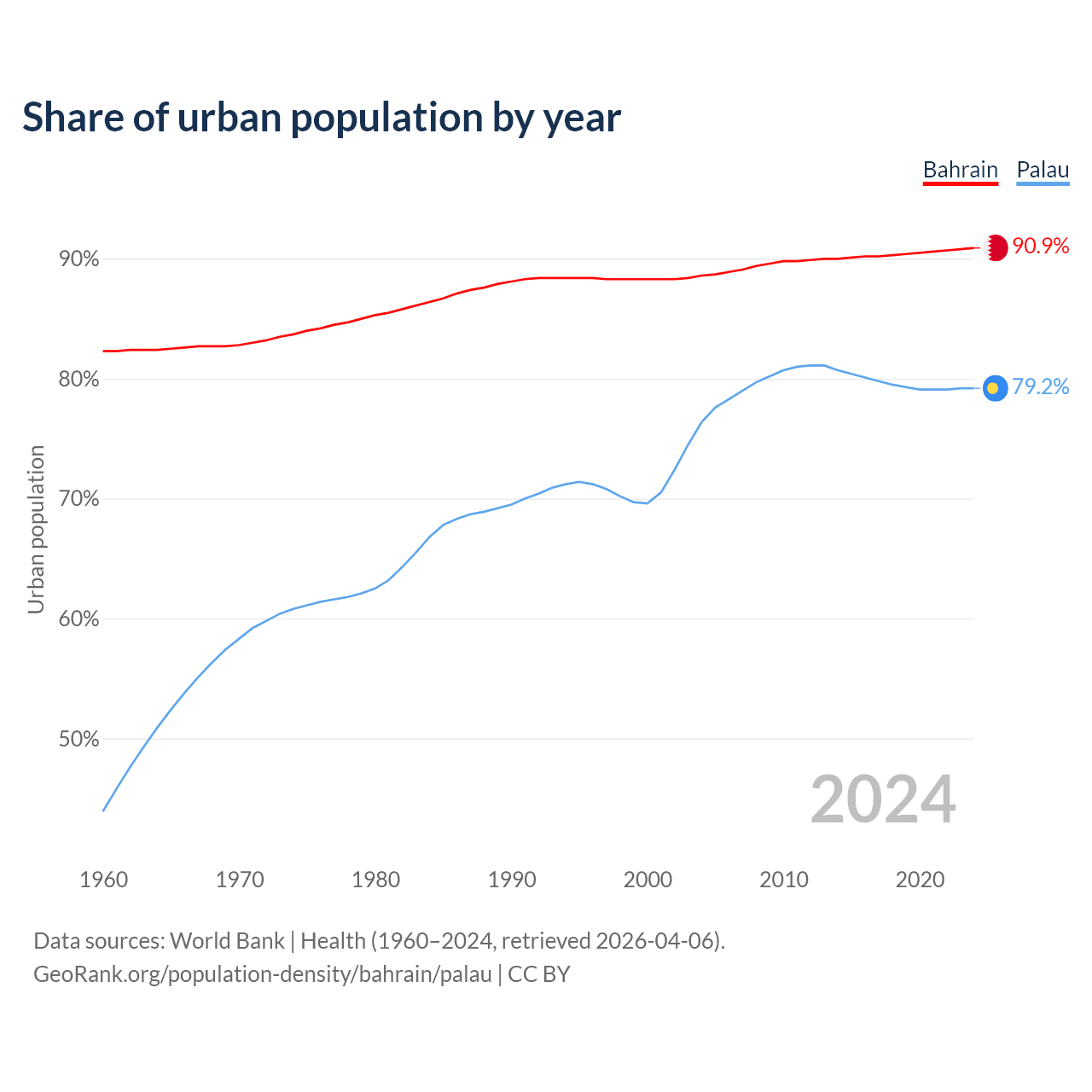 From 2004 to 2024, the share of urban population changed from 88.6% to 90.9% in Bahrain and from 76.4% to 79.2% in Palau.