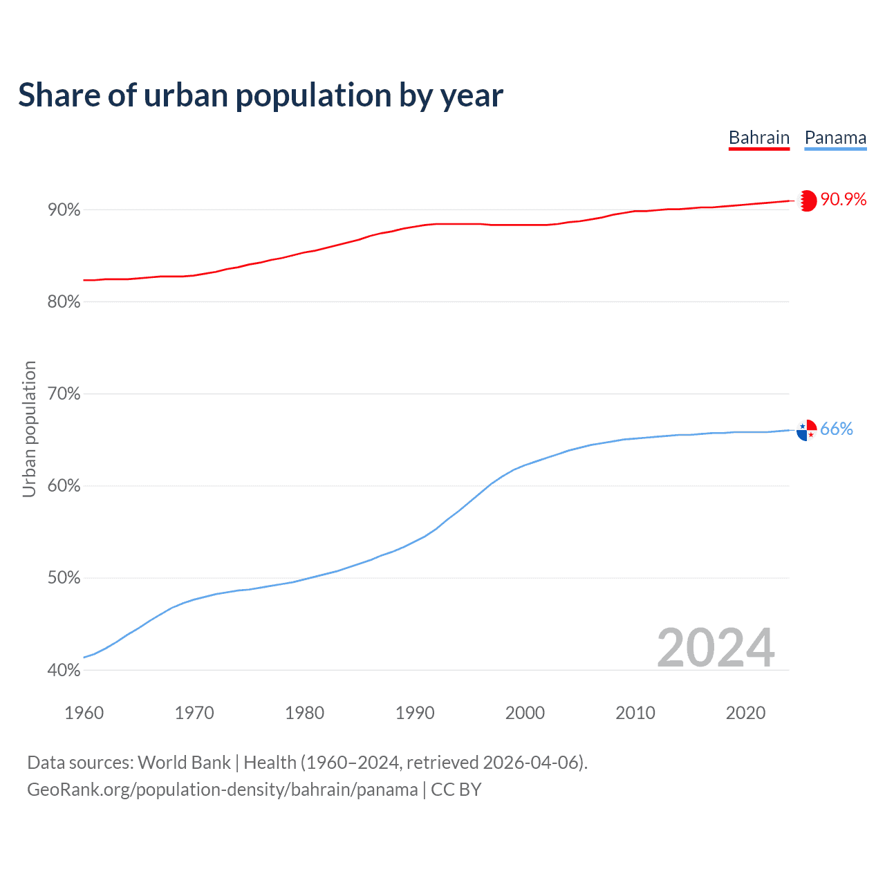 From 2004 to 2024, the share of urban population changed from 88.6% to 90.9% in Bahrain and from 63.8% to 66% in Panama.