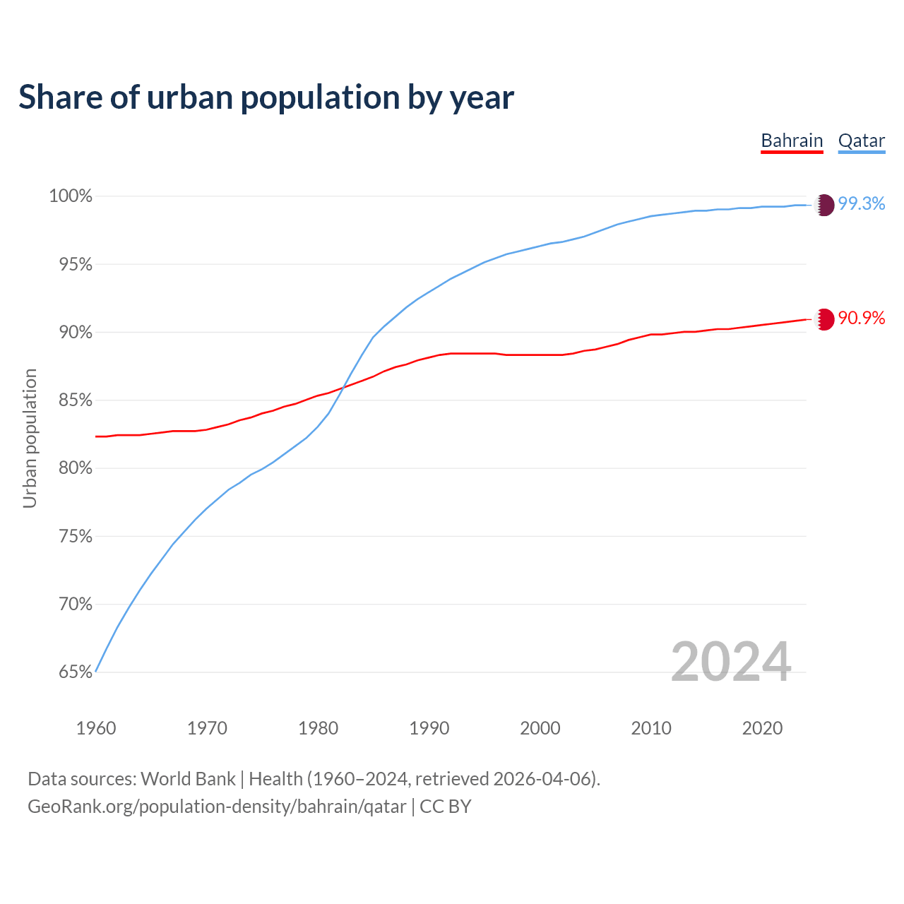 From 2004 to 2024, the share of urban population changed from 88.6% to 90.9% in Bahrain and from 97% to 99.3% in Qatar.