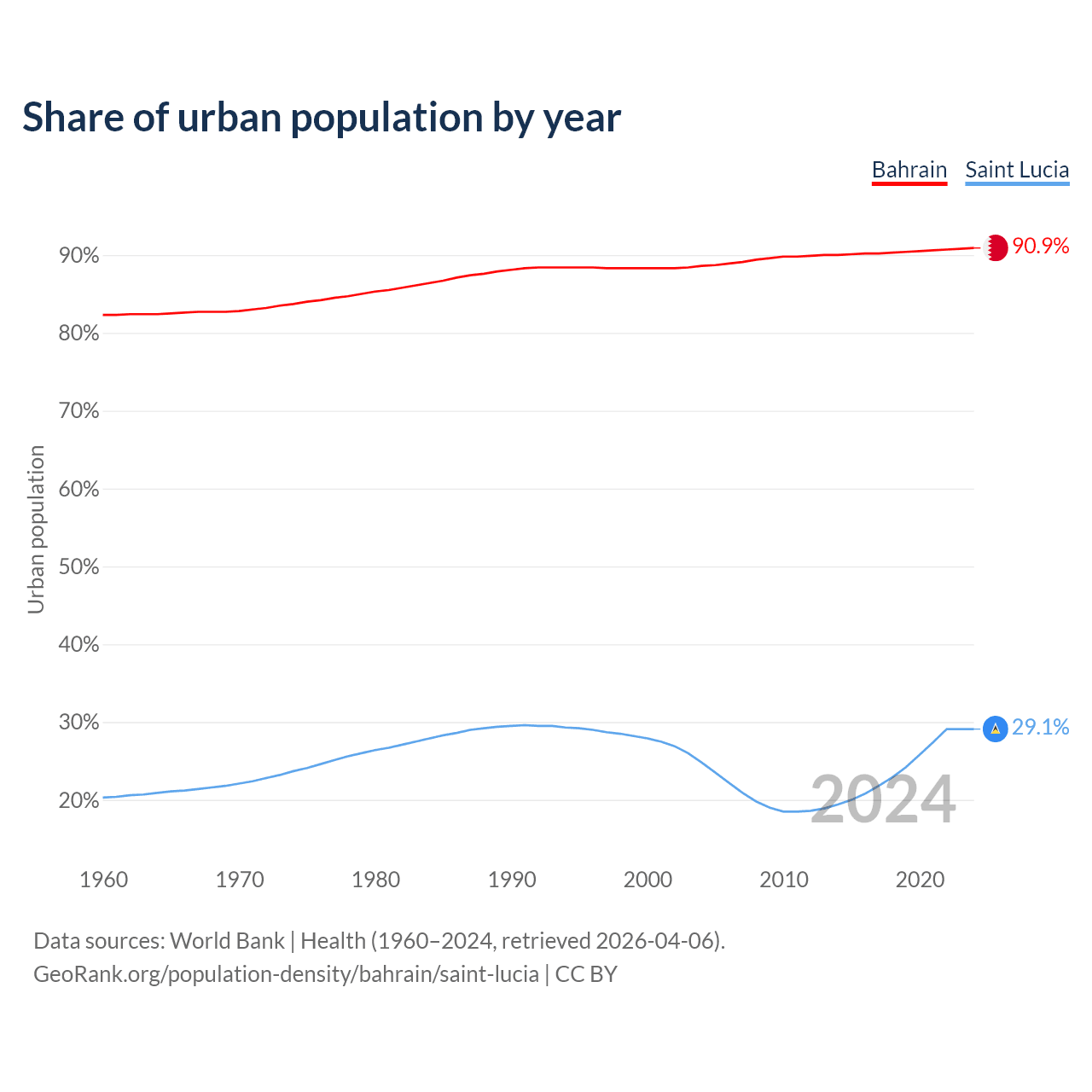 From 2004 to 2024, the share of urban population changed from 88.6% to 90.9% in Bahrain and from 24.8% to 29.1% in Saint Lucia.
