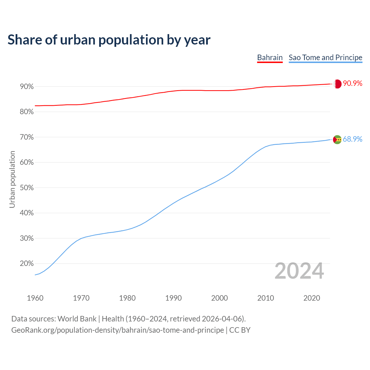 From 2004 to 2024, the share of urban population changed from 88.6% to 90.9% in Bahrain and from 57.9% to 68.9% in Sao Tome and Principe.