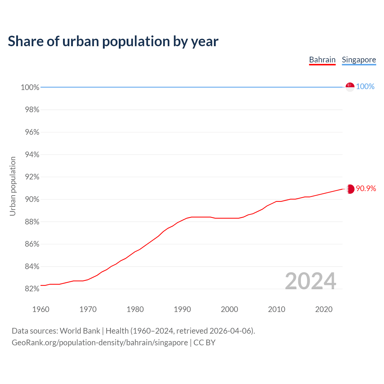 From 2004 to 2024, the share of urban population changed from 88.6% to 90.9% in Bahrain and from 100% to 100% in Singapore.